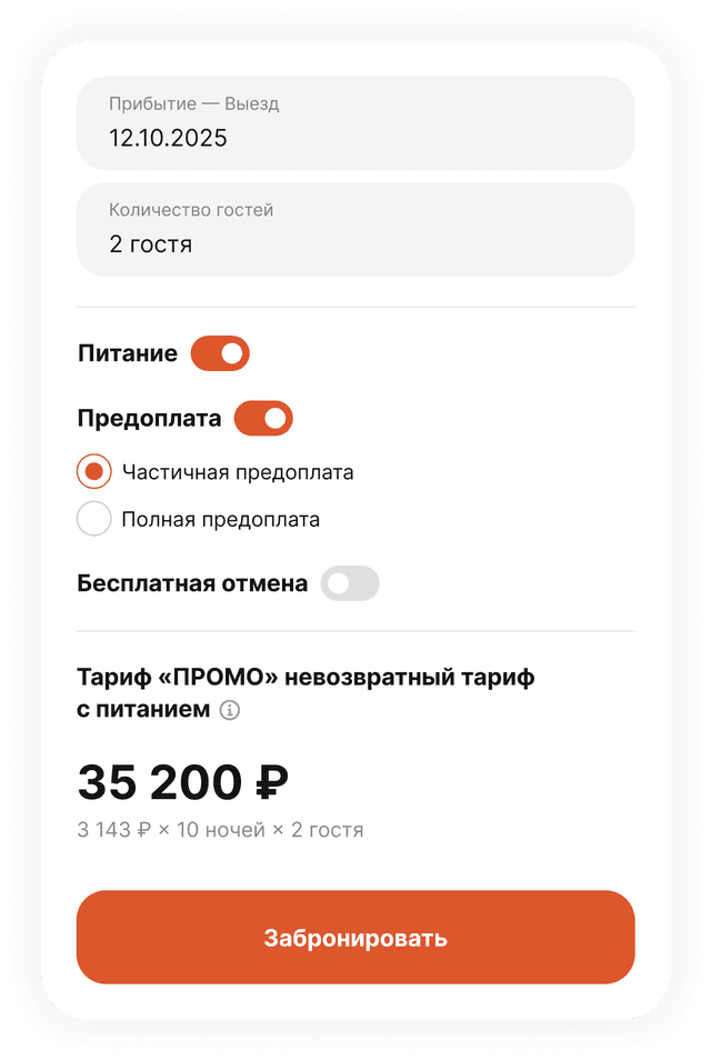 Гость выбирает даты, видит актуальные цены, оформляет бронь — вы получаете уведомление и запись в PMS.